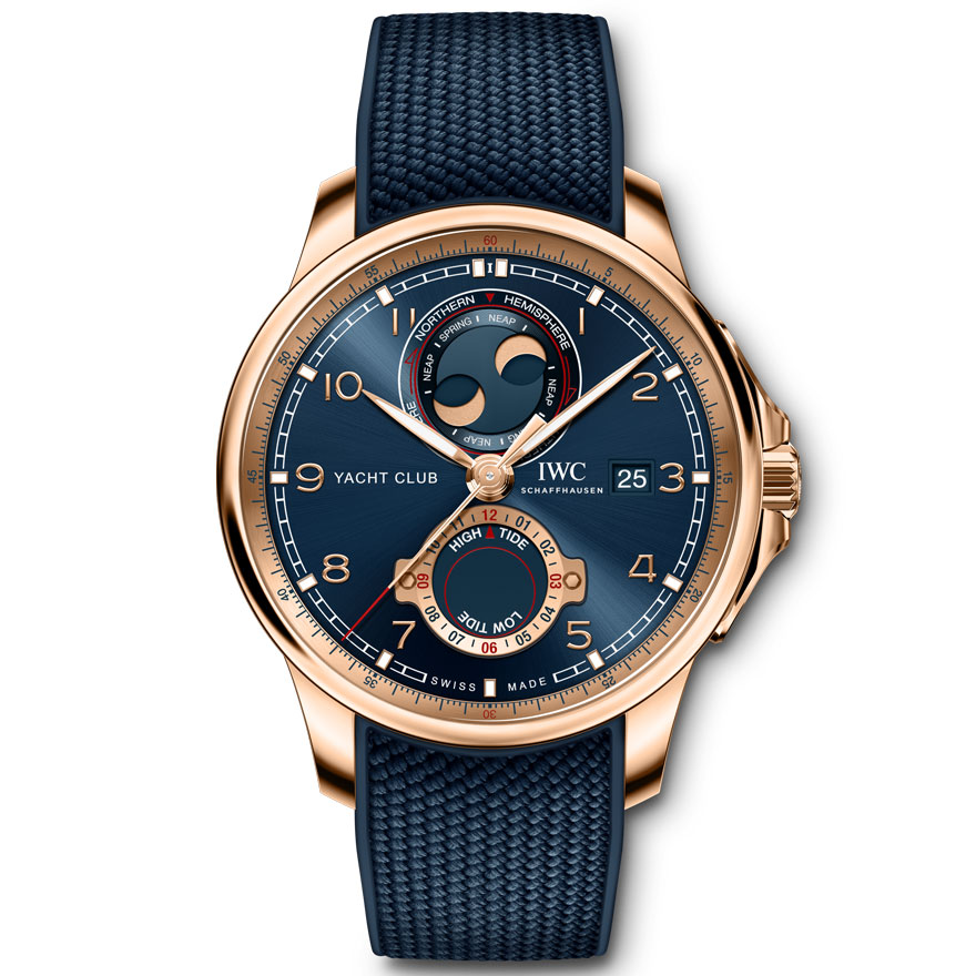 ヨットデッキでの活動時にも、陸に上がってからのひとときにも良きパートナーとなる、高い堅牢性を備えたポルトギーゼ・ヨットクラブ。同コレクションにIWC初となるタイド表示機能を搭載したモデルが追加された。マリンスポーツにおいて重要な次の満潮と干潮の予想時刻を6時位置のサブダイアルに表示し、12時位置のダブルムーンフェイズ表示には、大潮と小潮だけでなく、潮流の強さに関する情報も表示可能とした。IWC自社製キャリバー82835の巻き上げ機構にはおなじみのペラトン機構を採用。