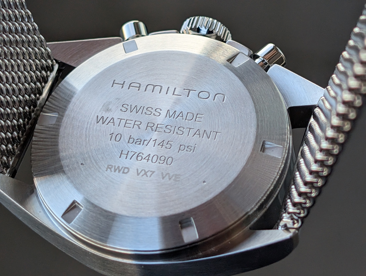 ケースバックには、ブランド名やスペックなどが刻まれている。官給品としてのミリタリーウォッチは、ケースバックに識別番号などが刻印されていることが多い。本作もそれに倣ったデザインを採用しているのだろう。残念ながらムーブメントを鑑賞することはできないが、硬派なミリタリーウォッチらしさを感じる要素だ。