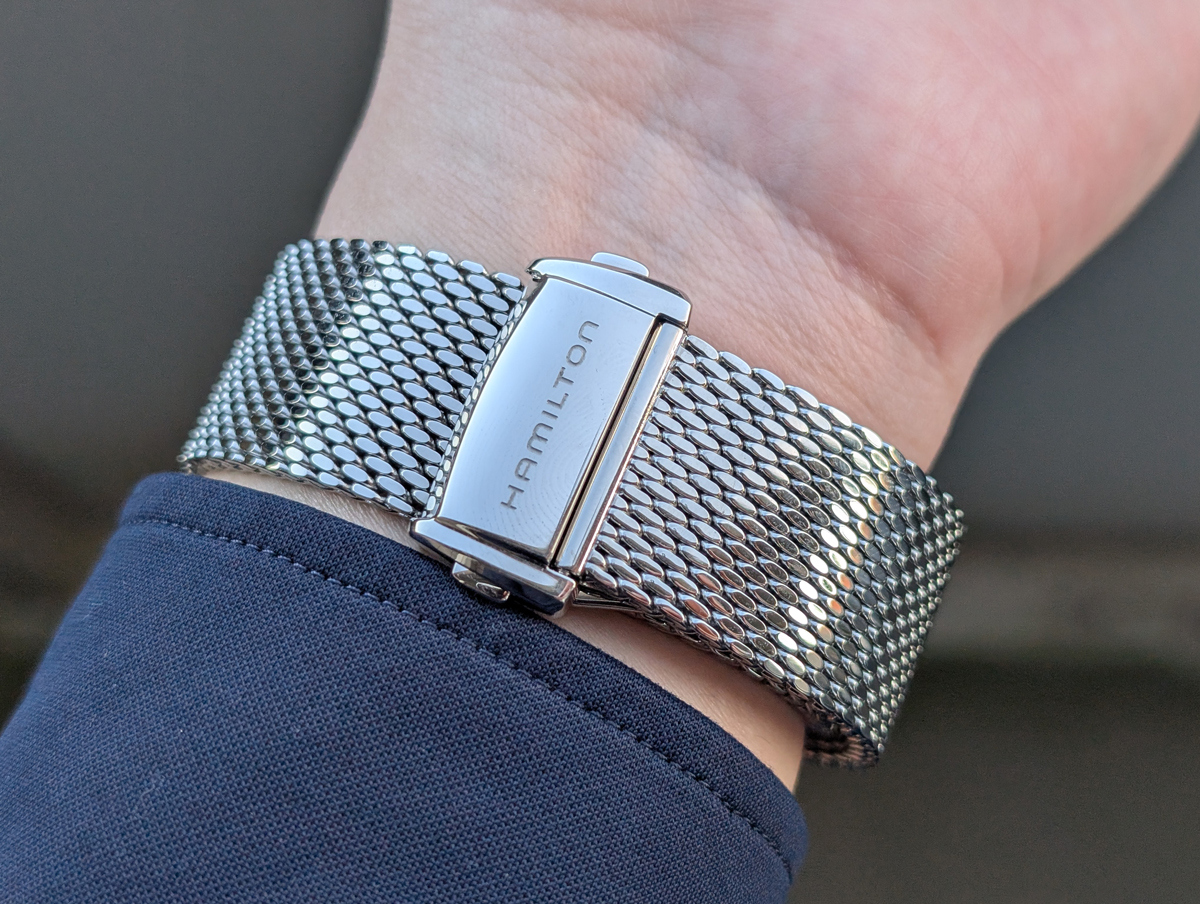 そのことに加え、ブレスレットの存在も装着感の良さに貢献している。本作に装着されているのは、しなやかに動くメッシュタイプのステンレススティールブレスレットだ。一般的なブレスレットは、コマの抜き差しによって段階的にサイズを調整するが、このメッシュブレスレットではバックルのロックを解除し任意の位置までスライドさせることで、自分の手首ぴったりに調整することができる。22mmというケース径に対して広めのラグ幅は、肌とブレスレットの接地面積を増やし、装着感を安定させることにも一役買っている。