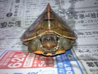 今朝、起きて飼っている水カメ(セタカガメ)にエサをやろうと、水槽を見ますと・・・、