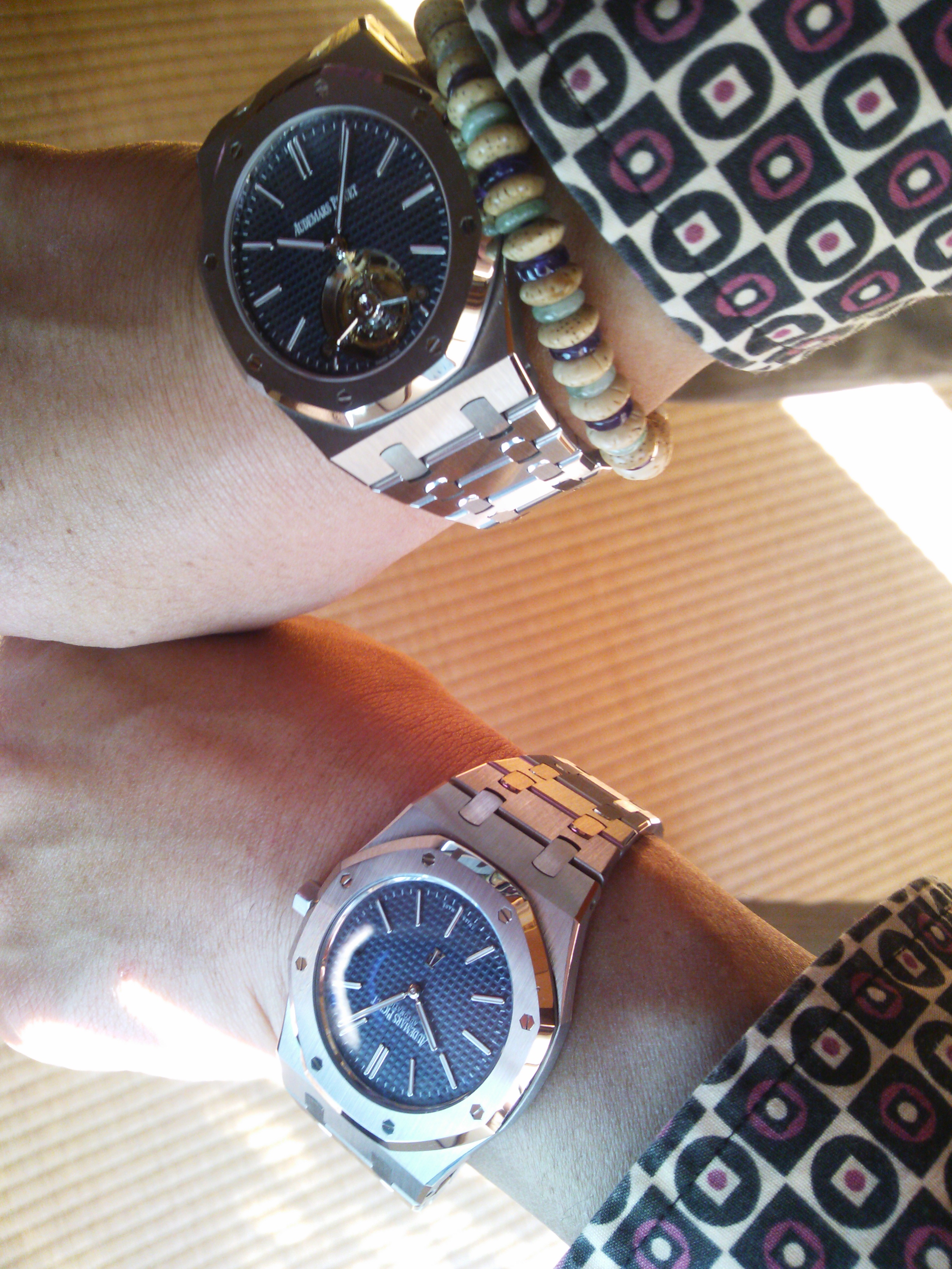 両腕にロイヤルオークなんて豪華ですね~。シャツの袖口でワールドタイムさんだとすぐわかります(笑)。