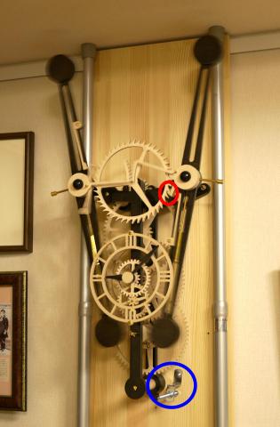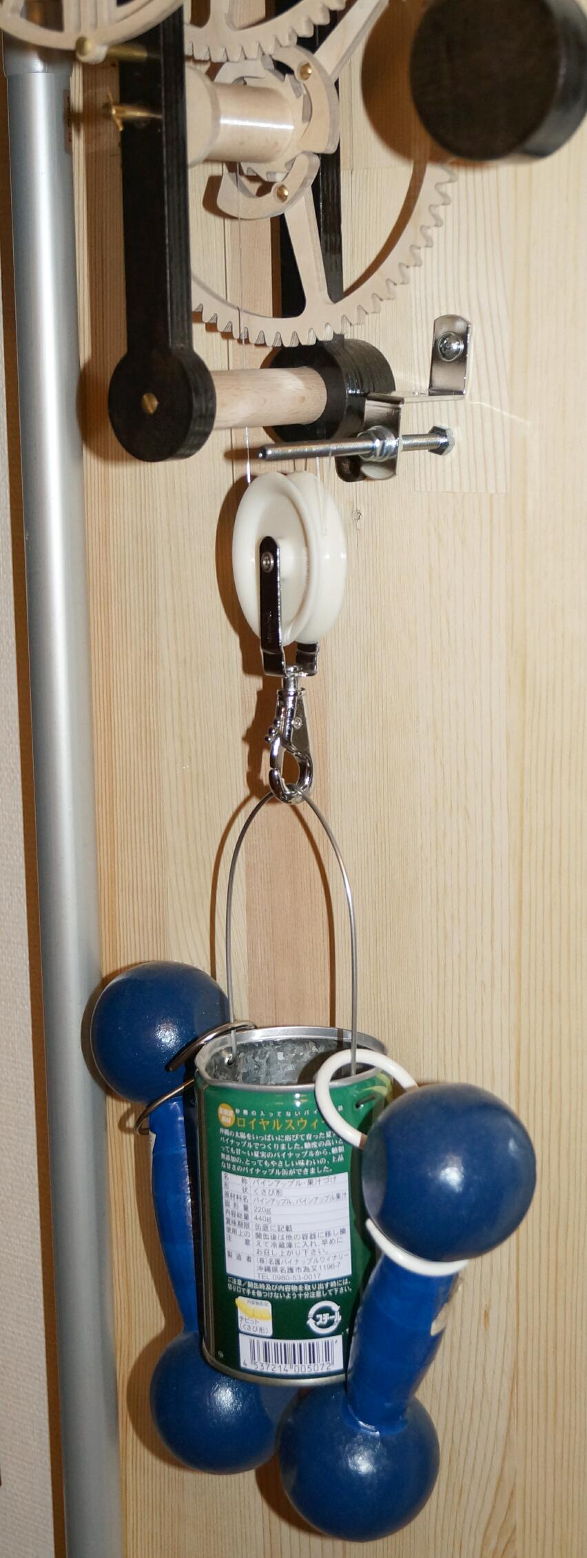 現在は写真のように動滑車1個による標準的な駆動方式とし、重錘は5.1kg程度となっています。超絶技巧ワイヤリング時に6kg程であったことを考えるとかなりの効率化が図られたといえます。