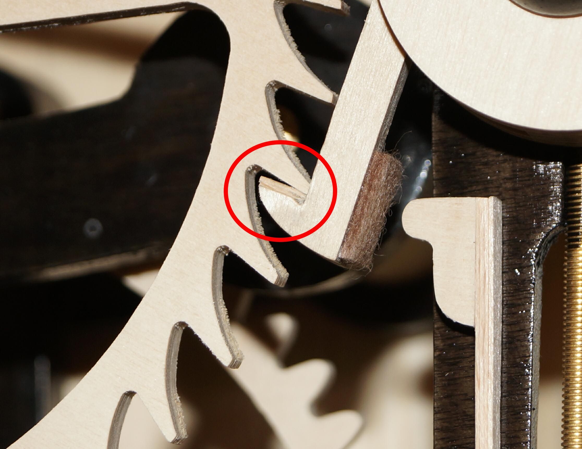 写真のように右バトンの爪に薄板を貼り嵩上げを行っています。脱進音を聞きながら嵩上厚を調整しました。この薄板は爪を受けるスプリングを作る際使った木のシートです。