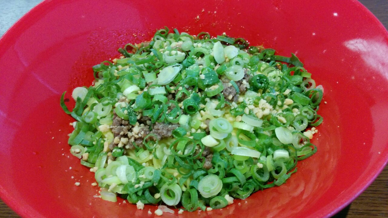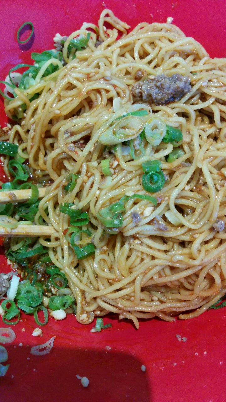 時間の関係で 汁なし担々麺を。混ぜる前と後。
