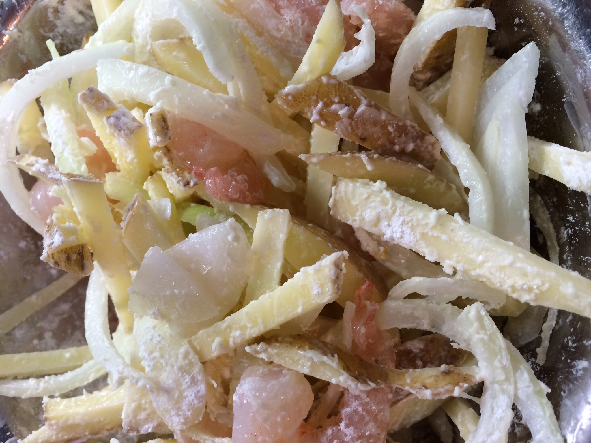「玉ねぎ、ジャガイモ、小エビ」と「カボチャ、ごぼう」を揚げてみますた。