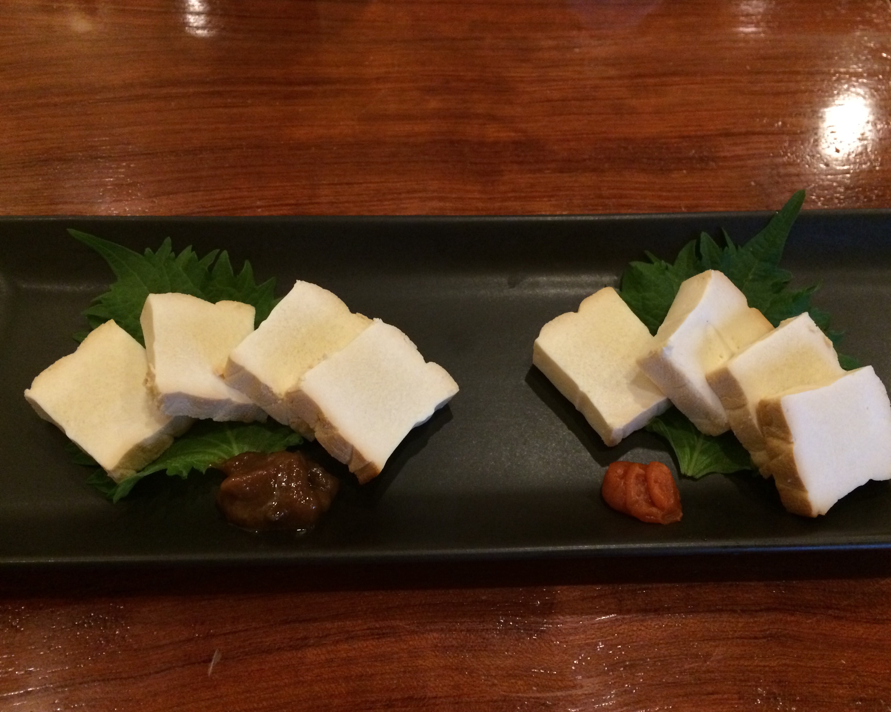 おつまみは、豆腐の燻製、左はねぎ味噌。右の赤いのは越後のかんずりです。