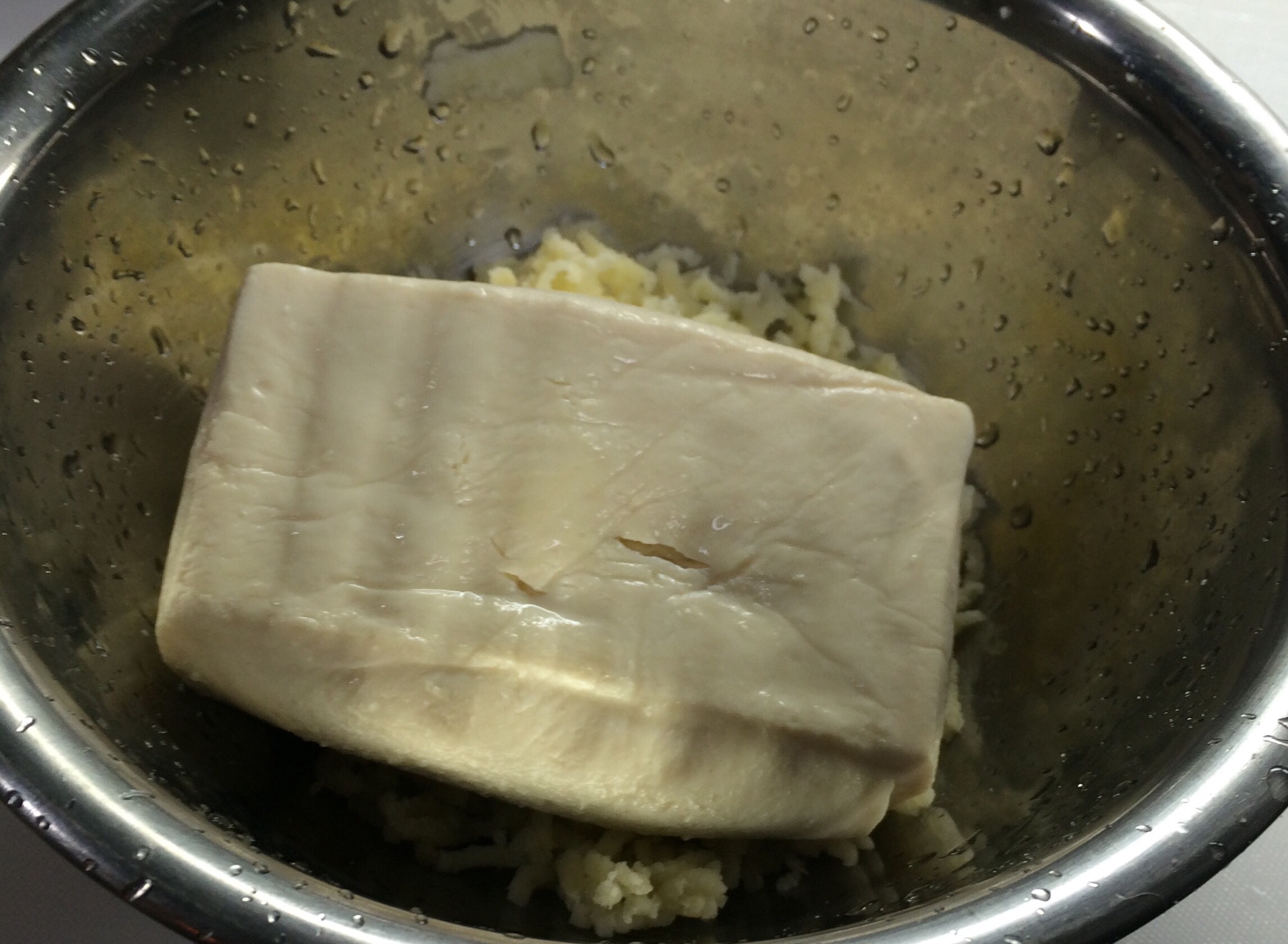 綿こし豆腐にお塩、キチンペーパーでキチンと包んで重しをかけ、水分抜いたものと合わせます。。。