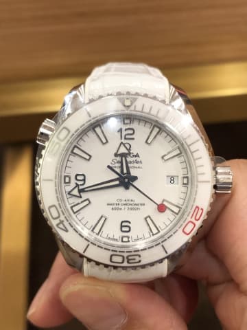 ホワイトセラミックのプラネットオーシャンは秒針のロリポップとベゼルの20が日の丸をイメージして赤になっています。