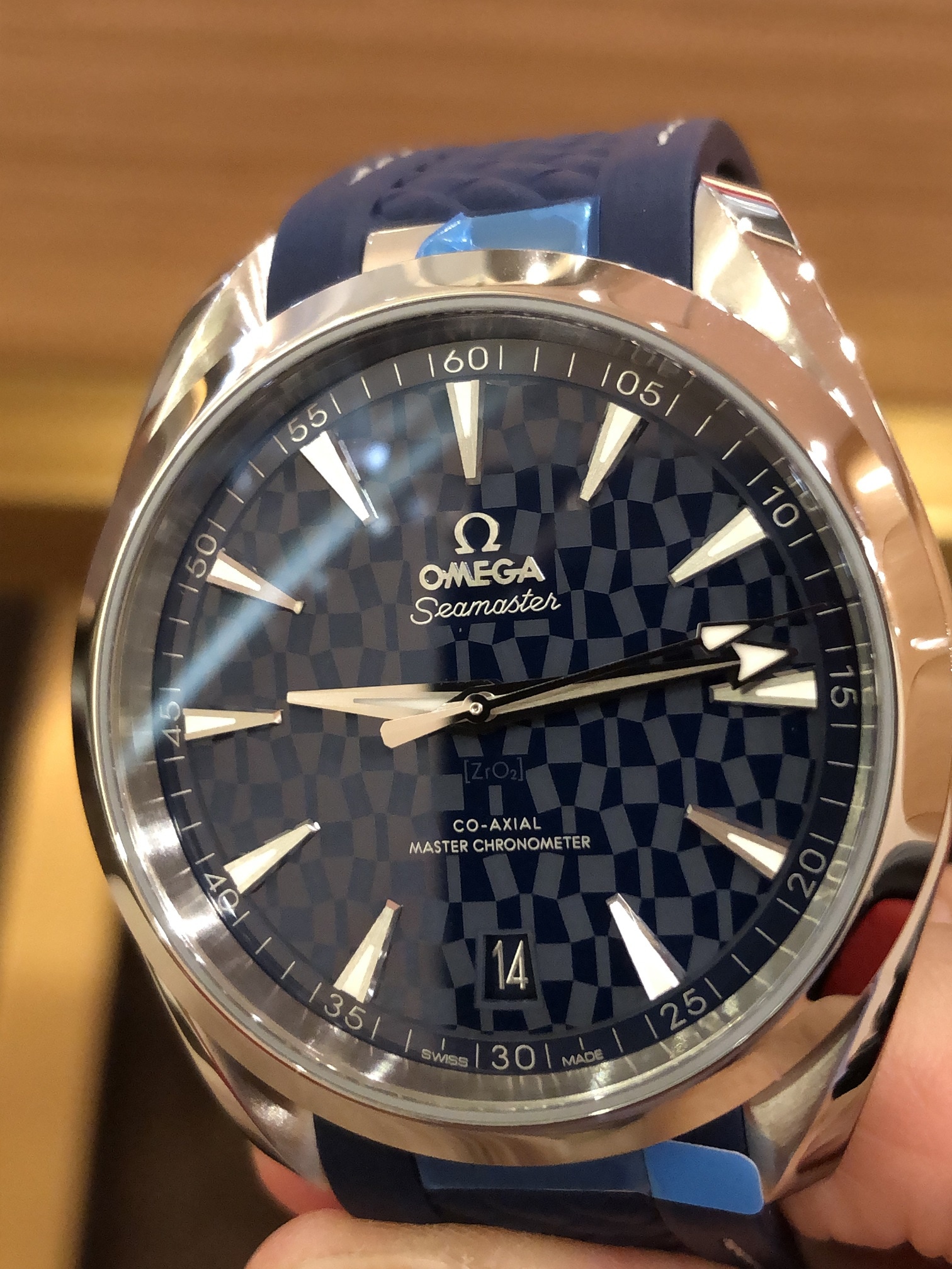 アクアテラの方はブルーのセラミック文字盤が組市松紋にデザインされています。