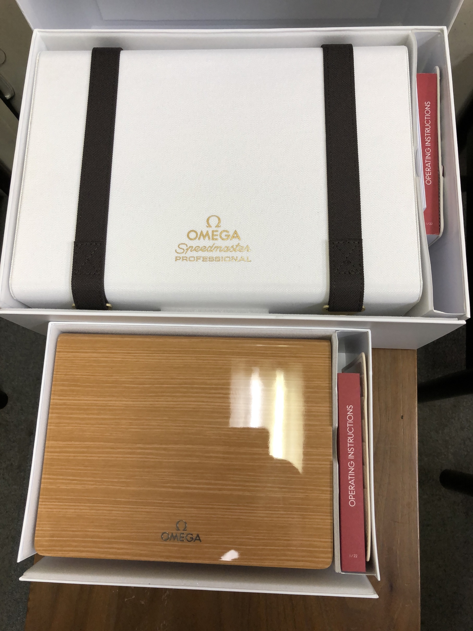 ところで、オメガのHPだと白い大きな箱に直接時計が入っているのかと思いましたが、木の箱に入っているのですか。