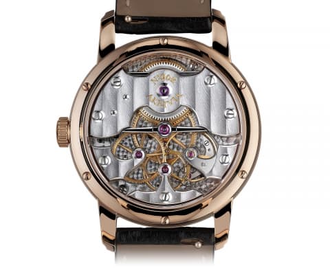 仕上げが素晴らしいのは言うまでもありませんが、それ以上にムーブメントの設計に驚かされます。輪列と受けが左右対称に配置されていて、中央の2番車が大きな存在感を放っています。このムーブメントはシングルバレルで100時間ものパワーリザーブを備え、ブザンソン天文台のクロノメーター認定を受けているので、スペック面も申し分がありません。