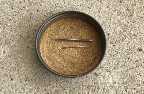 方法としては、上の画像の様に缶の容器に真鍮分を敷いて、その上に色を付ける鉄線を乗せ、アルコールランプで熱する、というものです。見様見真似なのでもっと良い方法が在るのかもしれませんが、この方法では2~3分待っていると鉄線が徐々に茶色くなり始め、そこから茶色が剥がれる様にして紫、青と順に色が変わっていきます。