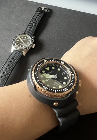 サイズ: ファーストはケース径38mm, ツナは52mm. 厚みは12.5mmと17.4mm。一方はダイバーズとして小径、一方はダイバーズとしても大きすぎる。