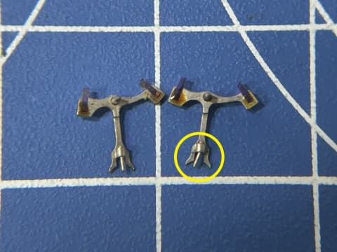 写真の通りアンクルの剣先がひん曲がっている状態です。最初はパーツ交換しない方針でやれないかと思い、曲げの矯正を試みましたが、こんな髪の毛のような部分でも思ったより硬く、アンクルの軸ごとひん曲がってしまいそうだったので断念。諦めて交換となりました。実はこれもハズレ個体であることが後に発覚し後で更に交換するハメになるのですが…(後述)