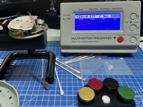 ゼンマイ巻いてみましたが、見るからに動きが違います。ワクワクしながらタイムグラファーに乗っけてみたところ、平置きで振り角320°、ビートエラー1.6msまで改善されておりました。振り角はともかくビートエラーまでもがここまで改善されるとは(2.9ms→1.6ms)。爪石バッキバキでしたもんね…(写真3-①)