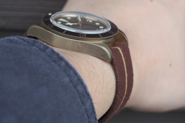 ケースバックまで覆うストラップには、ファブリック素材にありがちな不快なごわつきがない。類似した見た目を持つNATOストラップは、バネ棒を外さずとも取り付けられる構造を持つが、取り付け方によって時計の位置がずれて着用感が微妙に変わることもある。また、ストラップ自体が長く作られているため、余った剣先を折り込む必要があった。しかし、チューダーのファブリックストラップは、バネ棒が固定であるために時計の位置が常に定位置に保たれ、かつ余分な剣先が出てこないようにバックルで長さを調整できる仕様を持つ。