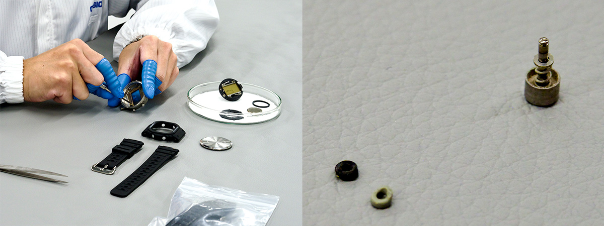ところで、この樹脂の外装とバンドを持つ初代G-SHOCKのレストアで問題になるのが、絶対に交換が必要なこの外装パーツをどうやって調達するか、だ。通常、補修部品のストックは7年〜10年。各メーカーの自主基準であるガイドラインで義務付けられた期間より長くキープされていることが多いが、これが枯渇すると修理NGになる。