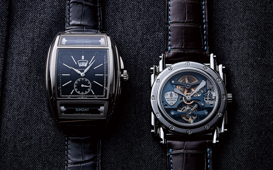 40歳を過ぎた頃に数々の会社を売却し、現在は投資家としての才を発揮しながら、家族との時間を第一に過ごすSさん。その充足感は近年の時計の選び方にも表れている。コレクションの中には、マニュファクチュール・ロワイヤルやメートル・デュ・タン、RJやHYTといった小規模ブランドの製品ながら、ギミックが秀逸な腕時計が並ぶ。機械的な面白さに目を向けるきっかけになったのは、フランク ミュラーとの出合いからだ。「イギリスのTVRという扱いの難しいライトウェイトスポーツカーを買う時に、それに合った腕時計を用意しておこうと思って手に入れたのが『クレイジーアワーズ』でした」。