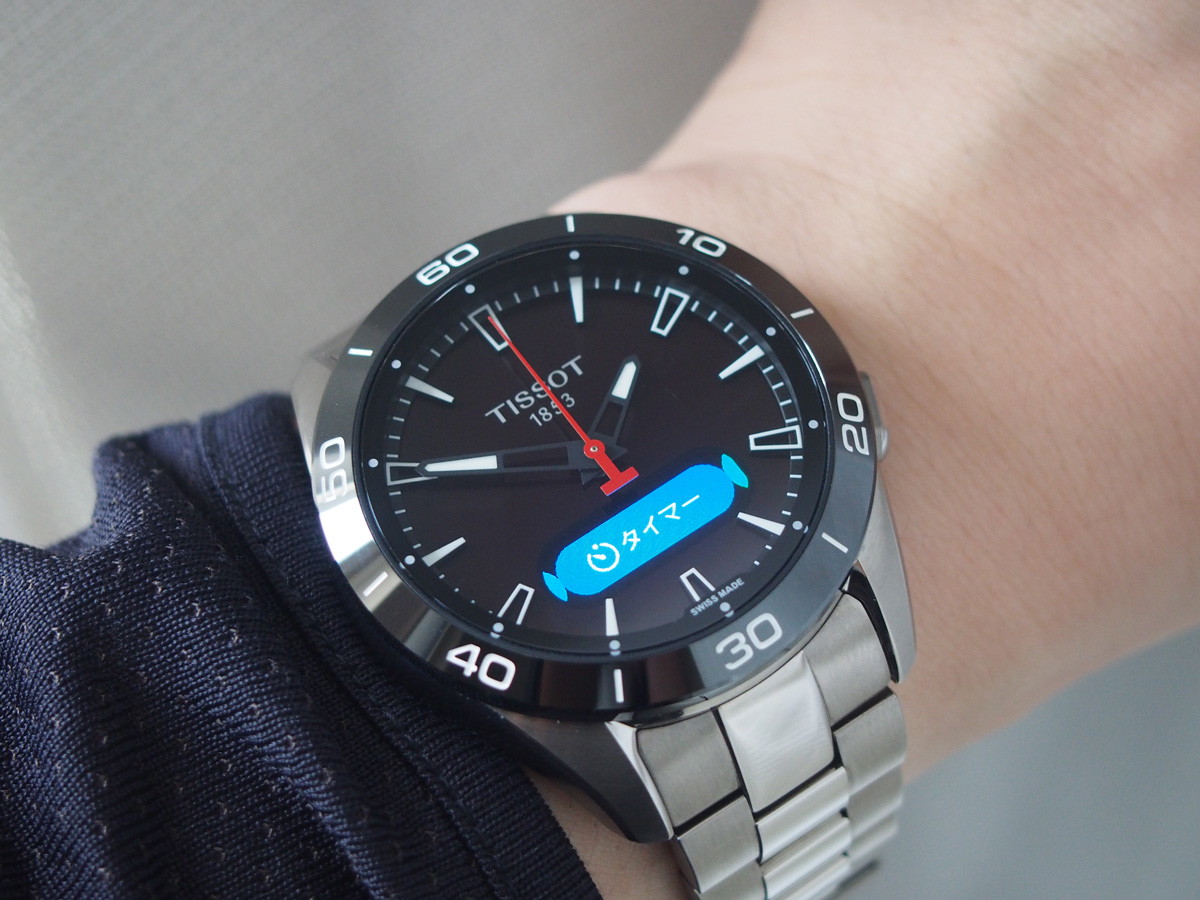 最初に、簡単に操作系に触れておこう。コネクテッドウォッチであるからして、その操作系はそのまま時計の使い心地に影響する。“T-タッチ”という名前を持つことから分かるように、本作はサファイアクリスタルを指先で触れることで操作することが可能だ。構造としては、サファイアクリスタルの下に針があり、さらにその下のダイアルに液晶が収められている。そのため、指先が触れる部分とその操作結果が反映される部分には物理的な距離が伴うが、操作のしにくさや反応の遅滞は認められない。それどころか指先で表示が隠れにくいため、ストレスなく操作することが可能だ。