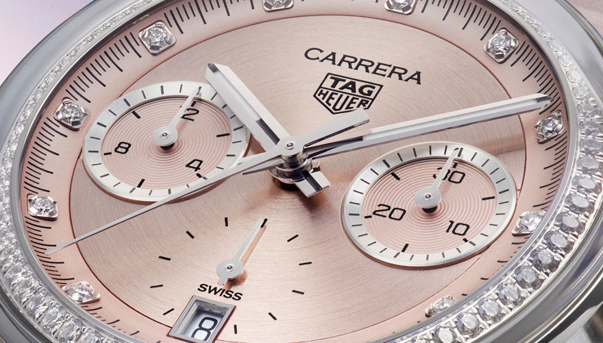 「タグ・ホイヤー カレラ デイト」の新作はそれぞれ個性的な色使いと仕上げによって、エレガンスだけでなく、モダニティーも反映するようデザインされている。パウダリーピンクのモデルは、サンレイ加工サテン仕上げのダイアル、ライラックのモデルは特徴的なスネイルとサテン仕上げのダイアルが目を引く。このふたつの仕上げにより、それぞれのタイムピースがパステルのカラーパレットの中で独自の個性を発揮し、タイムレスなスタイルやトレンドを意識したスタイルを選ぶことが可能になった。