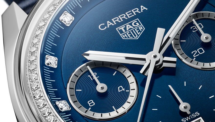 インナーフランジに沿って優美な曲線を描き、プレシャス感をさらに高めているのが、合計で0.107カラットの11個のシャトン式ダイヤモンドインデックス。湾曲したインデックスが、弧を描くインナーフランジに沿ってなめらかに配置されることで、デザインの連続性が印象づけられ、タグ・ホイヤーのデザインの統一感と卓越性への妥協のない姿勢が表れている。