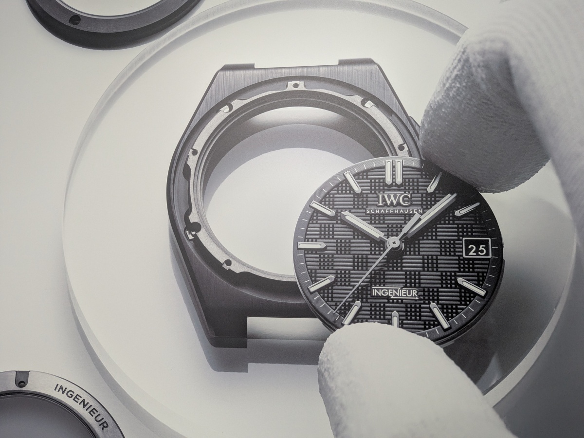 16時30分からIWCの撮影。今年は「インヂュニア」推しの年。個人的に感心させられたのは新しいインヂュニアのセラミックス。外装の質感をしっとりさせたのはいかにもIWC。そして、ムーブメントホルダーをギリギリまで薄くすることで、セラミックケースなのに直径42mmサイズを実現した。IWCはセラミックケースを太らせない配慮が際立っている。ちなみに今年、IWCは『F1』という映画のスポンサーをやるらしい。というわけで、会場にはその架空のF1コンストラクターである「APX GP」のマシンが置かれていた。
