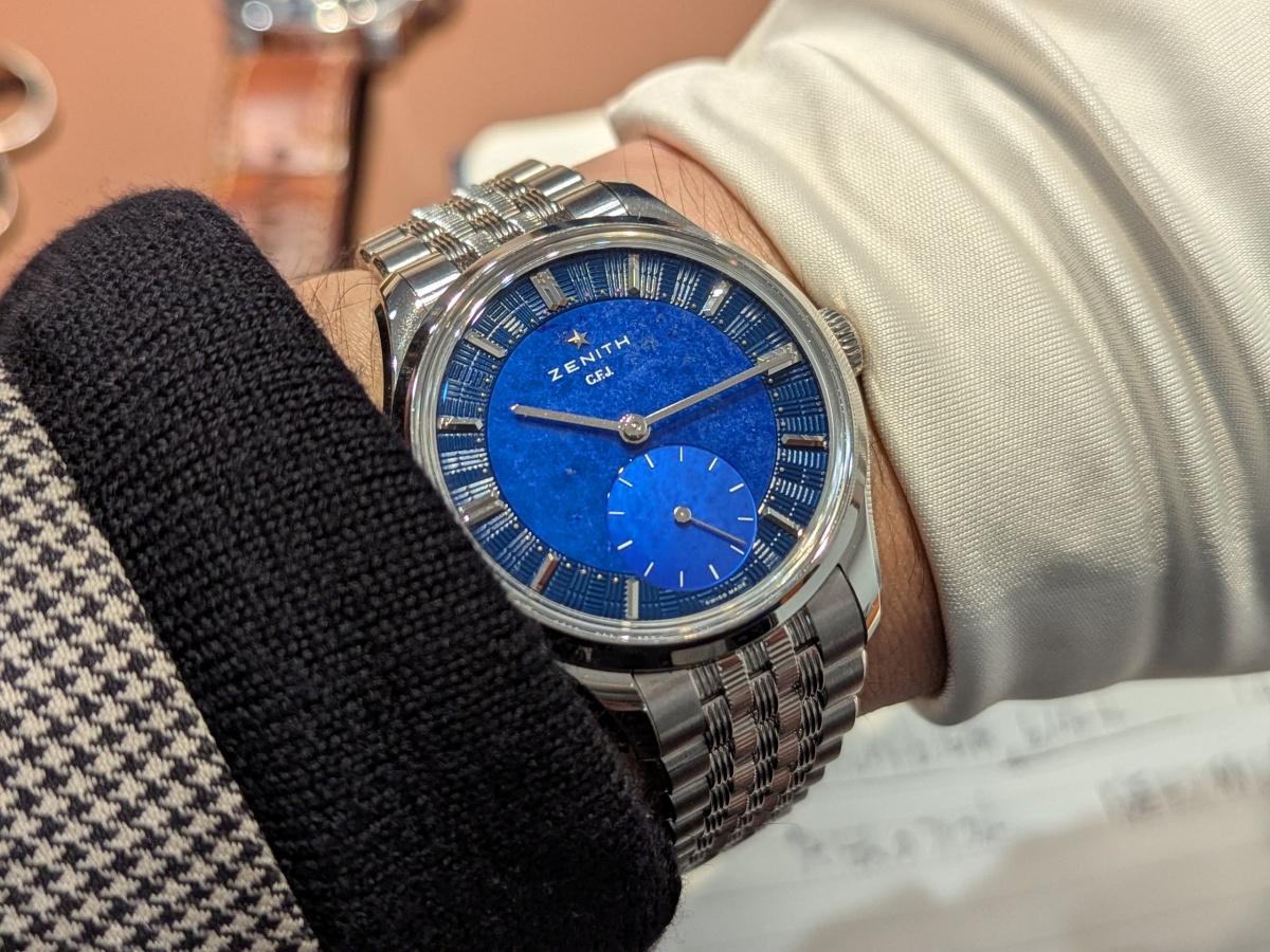 今回用意されたのは2モデル。直径39.15mmのケースで、レザーバンド付きか同素材のブレスレット付きだ。文字盤とムーブメントには、ゼニスの工場の外観を模した刻み模様が施されている。これは好みが分かれるだろうが、個人的にはあり。傑作Cal.135はオリジナルとほぼ同じだが、パワーリザーブが大きく伸び(オリジナルは40時間ぐらいしかなかった)、面取りが強調されている。価格はかろうじて600万円台だから、中身を考えればかなり良い。