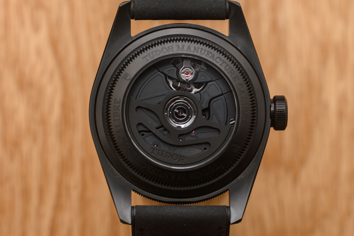 ケースのカラーに合わせてムーブメントはブラックに仕立てられており、ストイックな印象にまとめられている。開口部が小さいムーブメントのブリッジ構成は見るからに剛性が高そうだ。このあたりにも、高精度の秘訣があるのかもしれない。