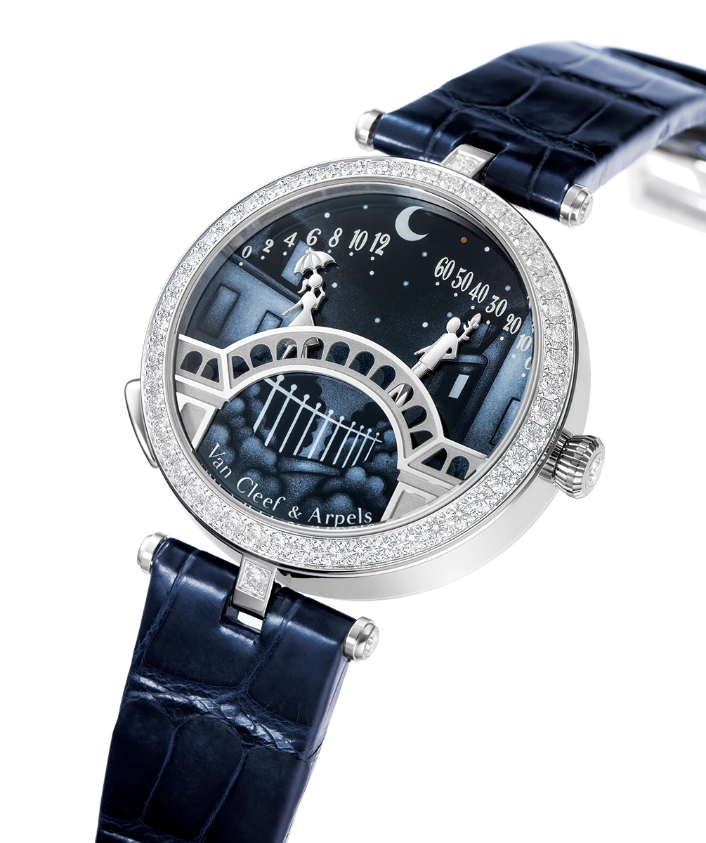 ヴァン クリーフ&アーペルが掲げるのは、「ポエトリー オブ タイム(詩情が紡ぎだす時)」という独自のビジョンである。文字盤装飾の極みとも言えるメティエダールの一方で、複雑機構を用いることで詩情溢れる世界観を描いてきた。「ポエティック コンプリケーション」の象徴たる橋の上の恋人たちが、永遠なる愛の物語を紡ぎ出す。