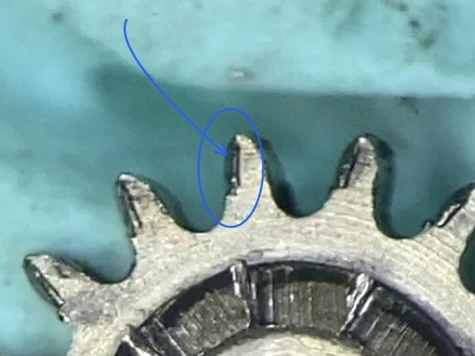 今回交換が必要となったパーツを見てみよう。通常のものと比較すると一目瞭然だ。歯車の歯の先がえぐれている。つまり、パーツが変形(摩耗)していることが分かる。ゼンマイ巻上を繰り返していく中で、形状が一部変形してしまった。それに沿って歯が滑ってしまい、噛み合いが外れたものが異音として手に伝わったと考えられる。