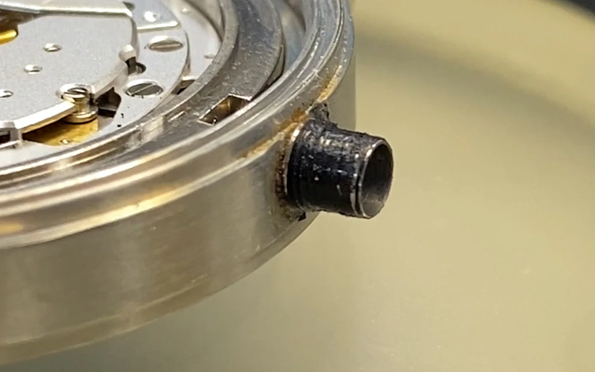 最大級の劣化を迎えると、除去は非常に手間がかかる。超音波洗浄機だけではもちろん落ちない。擦りながらであったり、条件次第で薬品を使いながら落としていく。リュウズ内部のパッキンのように手はもちろん、掃除用工具すら届きにくい箇所だと、泣きながら除去作業を行うこととなる。