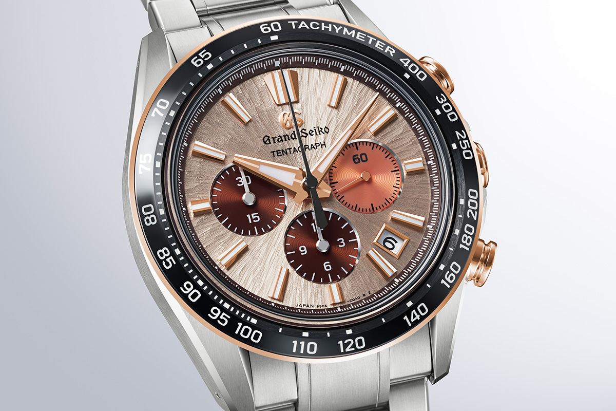 グランドセイコーが自動巻きクロノグラフ「テンタグラフ」搭載モデルに新作を加えた。岩手山に昇る朝日を映したカッパーピンクのダイアルを備える、「エボリューション9 コレクション テンタグラフ SLGC006」だ。サブダイアルとスモールセコンドにはやや色味の異なるブラウンを採用。インデックスやベゼルの一部はローズゴールドを採用した、暖色系統でまとめあげた意欲的なデザインのモデルだ。