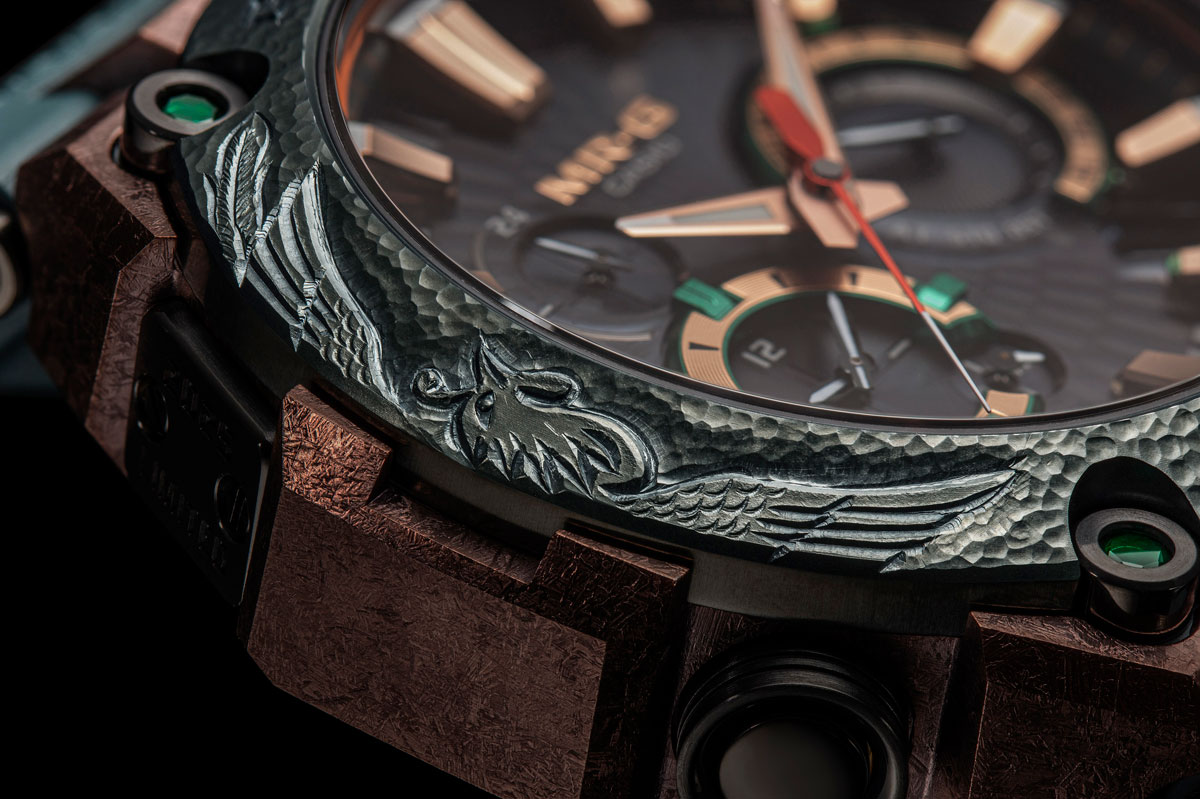 そして繰り返しとなるが、本作の剛健なチタンベゼルは、現代の名工により鐔のごとき装飾が手彫り込まれている。加えて銅色のケースには日本刀の「沸」にインスピレーションを得た処理が施されている。