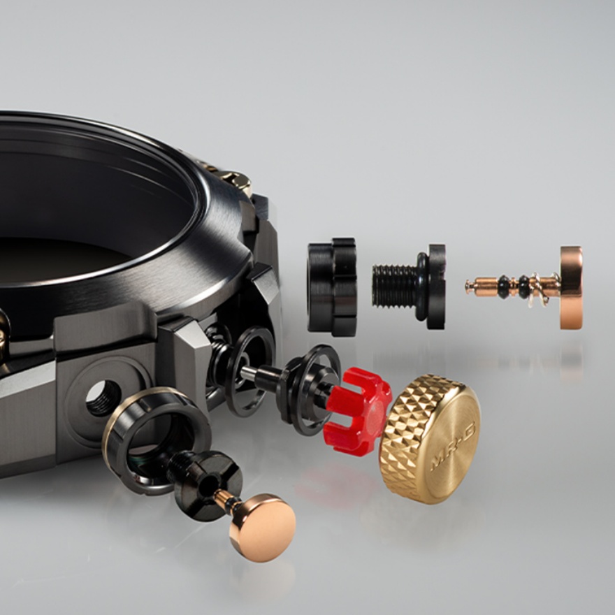 そこでリュウズやボタンの軸に耐衝撃パーツを組み込み、ガードとパーツを一体化。さらにリュウズユニットには「αゲル®」を内蔵するなど、より効率的な衝撃の緩和がなされた。リュウズガードを持たないため、結果として優れた操作性も実現している。