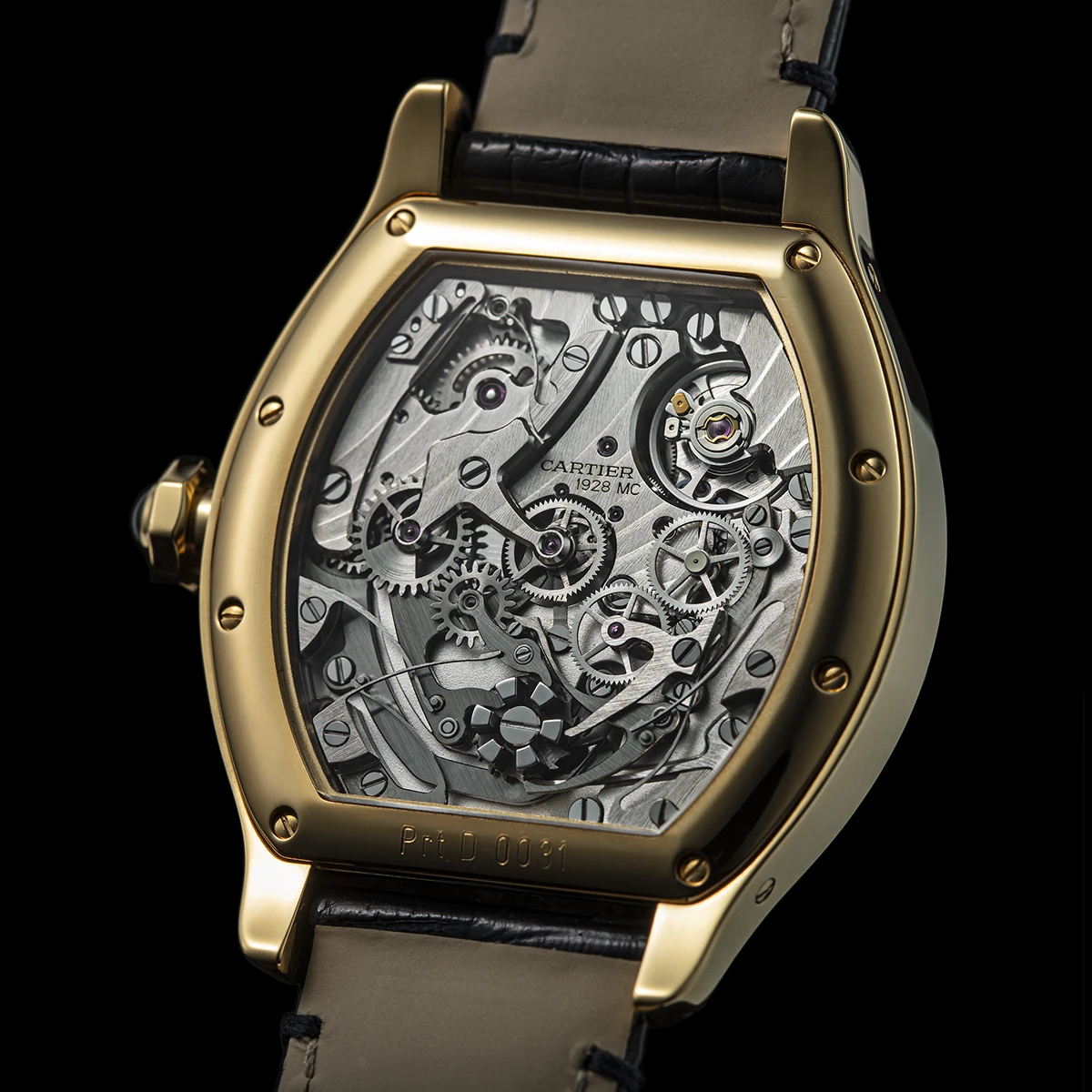 以前、このモデルは旧THA製の手巻きムーブメントを搭載していた。しかし、トノーに合うムーブメントを模索した結果、一から作り直すことになった、とカルティエは説明する。興味深いのは、ムーブメントのレイアウトだ。香箱とテンプがシンメトリーに配置されているのは、薄さのため。しかし、左右対称の造形を貫くため、コラムホイールは6時位置に置かれたほか、レバー類も可能な限りシンメトリーに配置された。堅牢な自社製ムーブメントを作ってきたカルティエが、本作では一転して、審美性を強く打ち出したのである。