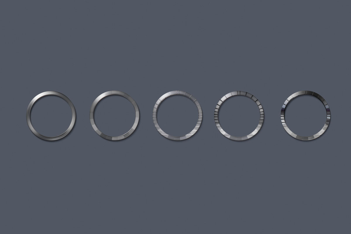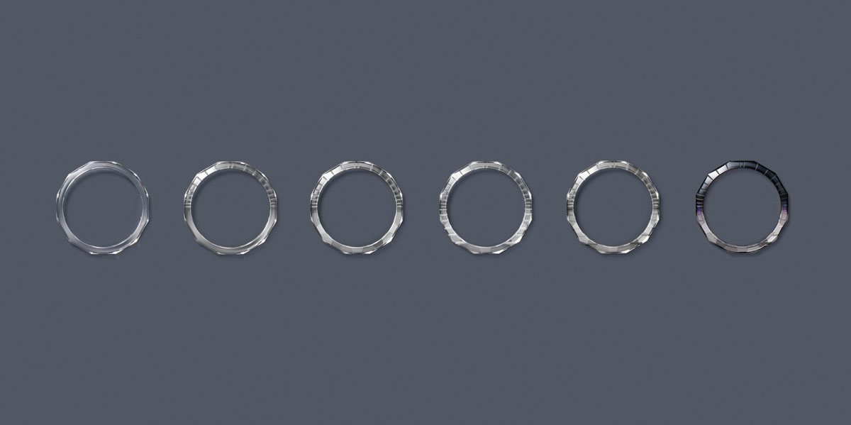 12時方向の表面上半分には、月明かりをイメージした放射線状の千筋(せんすじ)と呼ばれるカットが入る。そして6時方向の表面下半分にはランダムなカットと、裏面に水平の千筋が入る。つまり、ベゼルの上下で異なる文様が施されたのだ。さらに上からブラック、下からシルバーのグラデーション蒸着を行っている。蒸着による装飾は、見る角度によって色調が変化する。その特性を生かし、これまでのオシアナスとは異なる雰囲気を与えている。
