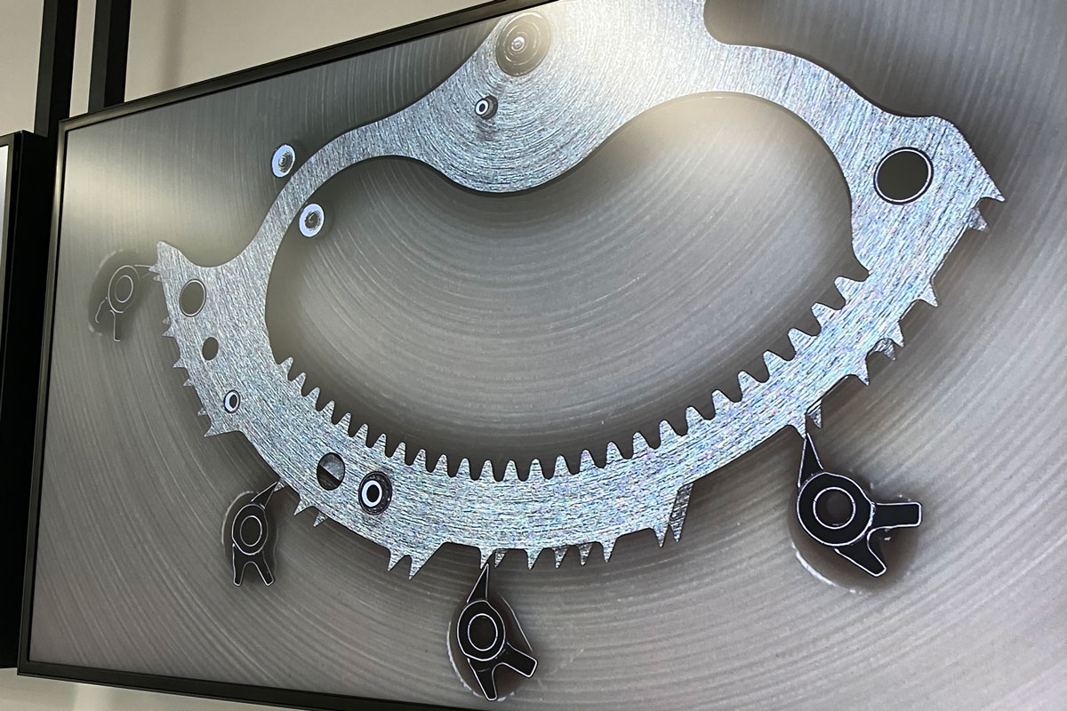 「ウェストミンスターの鐘」と「ブランパン」の2曲を奏でるために、このクォーターラックは2枚が重なって配されている。それぞれのメロディー選択はケースサイド9時位置のスライダーによって行われるが、内部ではコラムホイールを使って切り替えを行う。スライダーの作動と同時にコラムホイールが動き、選ばれた方のラックが、プログラミングされた音階を鳴らすのだ。なお、ムーブメントの地板や受けは18Kゴールド製だが、ソヌリやリピーター周りを中心に、歯車はステンレススティール製である。また、このコラムホイールのサイズは一般的なクロノグラフ用のものと同一とのこと。