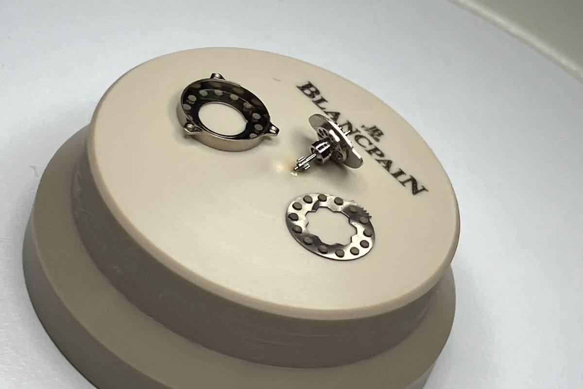 音質のほかに重要なのが、音量だ。気密性を保ったケースで音を響かせなくてはならないのが、リピーターやソヌリの製造が難しいと言われる要因である。もちろん防水性や防塵性を犠牲にすれば、いくらでもやりようはあるが、ブランパンが目指したのは実用的な腕時計。本作の発表時、そして今回の工房取材中に、ハイエックは「安心して毎日着用できる腕時計」を目指したと語ったように、飾って眺める工芸品のようなコンプリケーションではなく、あくまでデイリーユースできる1本であることが重要であった。そのためブランパンは、本作に18Kレッドゴールド製の薄い膜を、ケースに沿うようにして組み込んだ。この薄膜がスピーカーのようにゴングの振動を拾い、音波を振動としてサファイアクリスタル風防やベゼルまで伝え、十分な音量を響かせることに寄与している。