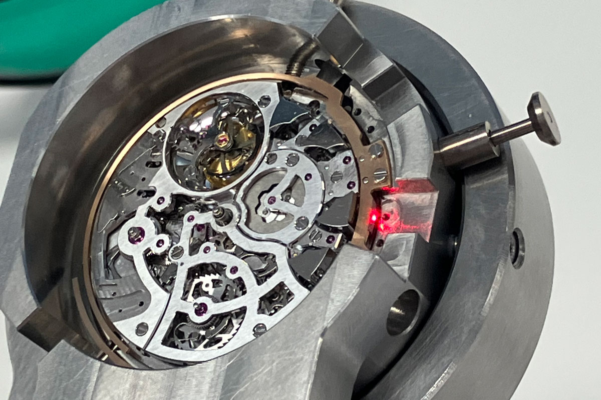 例えば本作のムーブメントは音が調整され、組み立てられた後、専用機械で信頼性が検査される。この検査には、大きく分けて「エイジングテスト」と「衝撃テスト」がある。5年間の着用を想定して、7000回以上チャイミング用の主ゼンマイを巻き上げ、ゴングは鳴らさないものの、ハンマーを作動させ続けるのだ。また、1300Gのショックを与えて破損しないかどうかのテストも実施される。