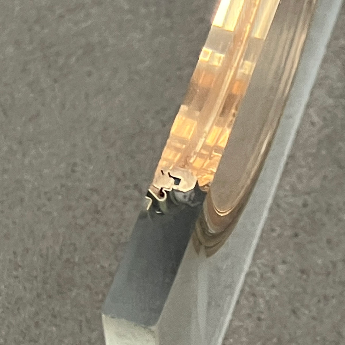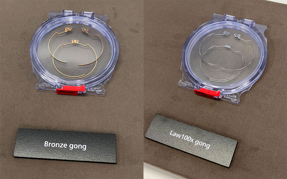 ゴングの形状も、特許技術だ。4音を奏でるために4つのゴングが搭載されており、それぞれが異なる断面を有している。なお、うちふたつ(「ファ」と「シ」)は一体化されており、省スペース化に寄与している。ゴングの形は同じスウォッチ グループ内、あるいは他社製品を参考にしたか尋ねたところ、「参考にしたものはなく、まったく新しいもの」という。ゴングの取り付けも計算されており、目指す周波数の音を奏でるために、ゴング同士を重ねつつ、しかしクロスさせたり触れ合ったりしないよう、細心の注意が払われている。
