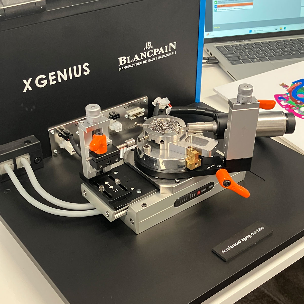 とりわけブランパンの弛まぬ追求の姿勢が表れているのが、ゴングだ。ブランパンに限らず、チャイミング系の腕時計はゴングやケースに何の素材を使うかが重要視される。一般的には18Kゴールドが多く、ブランパンのこのグランドソヌリも同様に18Kローズゴールド製となったが、この答えを導き出すために、R&D部門では11の原材料を試し、さらにその中から8つを選んで徹底的に調査した。この素材選びでも周波数を分析器を使って測定し、目指す音を的確にとらえるようにしたという。