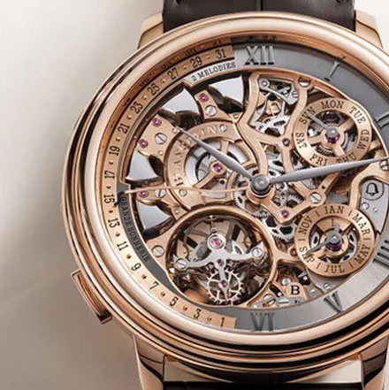 コンプリケーションにありがちな故障を防ぐために、5つの安全システムが設けられているのも特筆すべき点だ。その安全システムとは、巻き上げ軸に関連するものが「打鐘動作中の時刻設定機能の取り消し」と「時刻設定中の打鐘作動の無効化」、メロディー選択プッシャーに関連するものが「打鐘動作中のメロディー選択プッシャーのロック」と「メロディー選択プッシャー動作中の打鐘作動の無効化」、そして打鐘用パワーリザーブに関連するものとして、チャイミング用パワーリザーブが不足している場合は、チャイミング用の主ゼンマイが巻き上げられない限り、どの打鐘であっても無効化されるというものである。