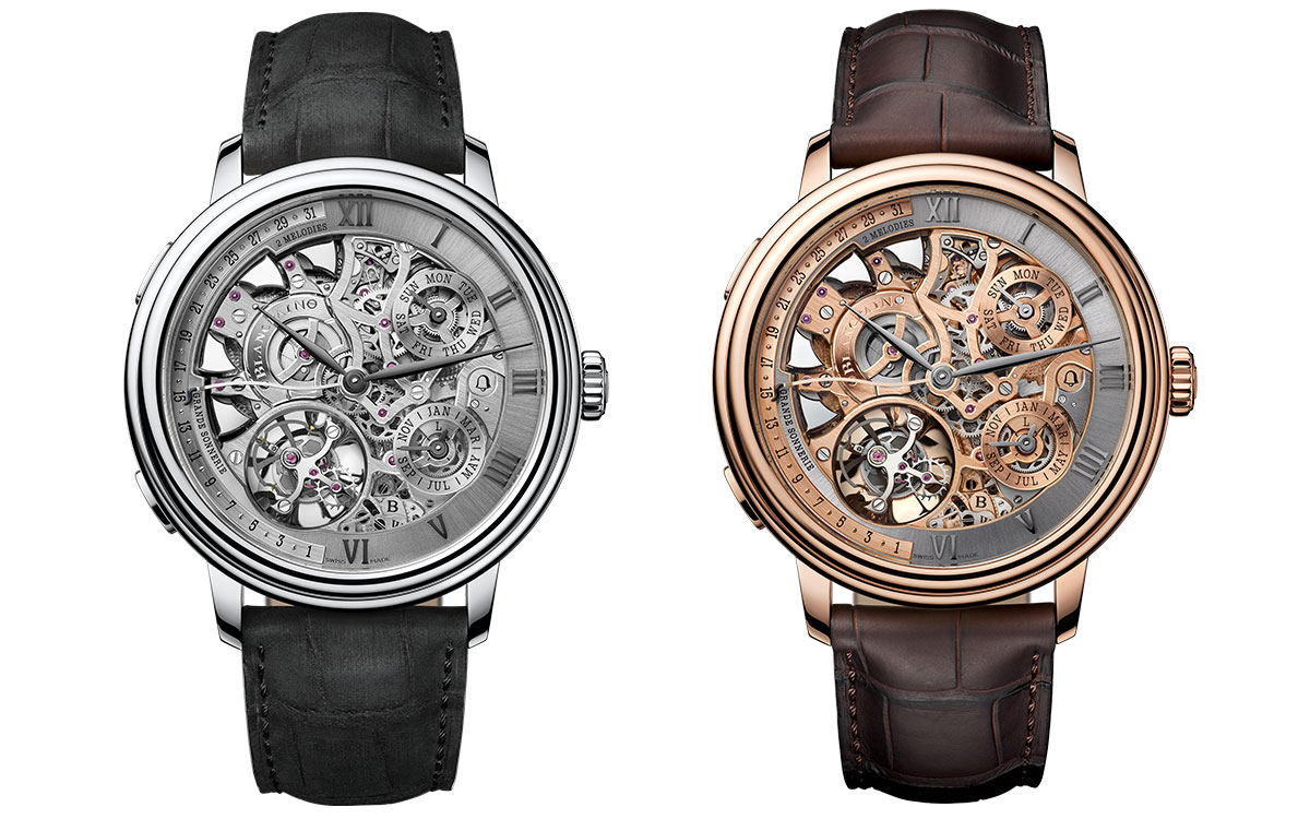 本作にはチャイミング機構と並んで高い技術力が求められるパーペチュアルカレンダーが搭載されている。これまでのブランパンのパーペチュアルカレンダーは、モジュールをベースムーブメントに組み込むことで実現してきたが、本作は腕時計として常識的なサイズに収めるために、新規開発を行い、一体型とした。手首から大きくはみ出てしまうサイズの腕時計を、クラシカルウォッチを得意とするブランパンは、美しくないとしたのだろう。省スペース化のためにレトログラード式となったカレンダー表示が、肉抜きされたブリッジからのぞく内部機構に干渉されず、すっきりとしたデザインを実現している。