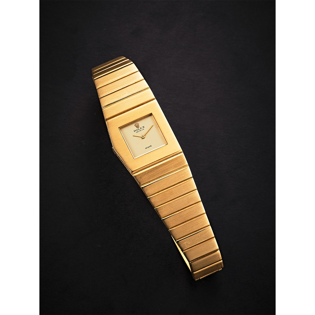 1962年の発表だと言われているキングマイダスは、多角形ケースを特徴とするモデルであり、左リュウズのバージョンも存在する。一体型のゴールドブレスレットは絹のように滑らかで、ロレックスの一般的なデザインとは一線を画す稀少な存在だ。