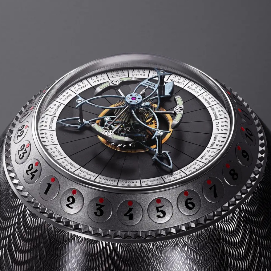 ファロスおよびロータス同様の回転する24時間リングと固定地名リングによるワールドタイム表示、トゥールビヨンの回転速度を24秒で1周に設定することで時間用の24分割インデックスで24秒も表示するというのがユニークだ。ギヨシェも24時間スケールに連続するように彫りこまれ、全体として調和したデザインになっている。