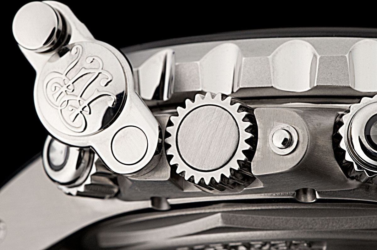 本作の耐衝撃性を向上させている機構が、「セーフティロック・クラウンシステム」である。外部とムーブメントの接点となるリュウズは、衝撃が加わることでムーブメントの破損につながりかねない。多くのスポーツウォッチではリュウズガードを備えることでリュウズに対する横方向の衝撃から保護する仕組みを備えているが、セーフティロック・クラウンシステムでは縦方向の衝撃を防ぐプロテクション・プレートを設けることによって、さらに保護性能を向上させている。このプレートはリュウズを完全にねじ込まなければ閉じることができず、ねじ込み忘れの防止としても機能する。