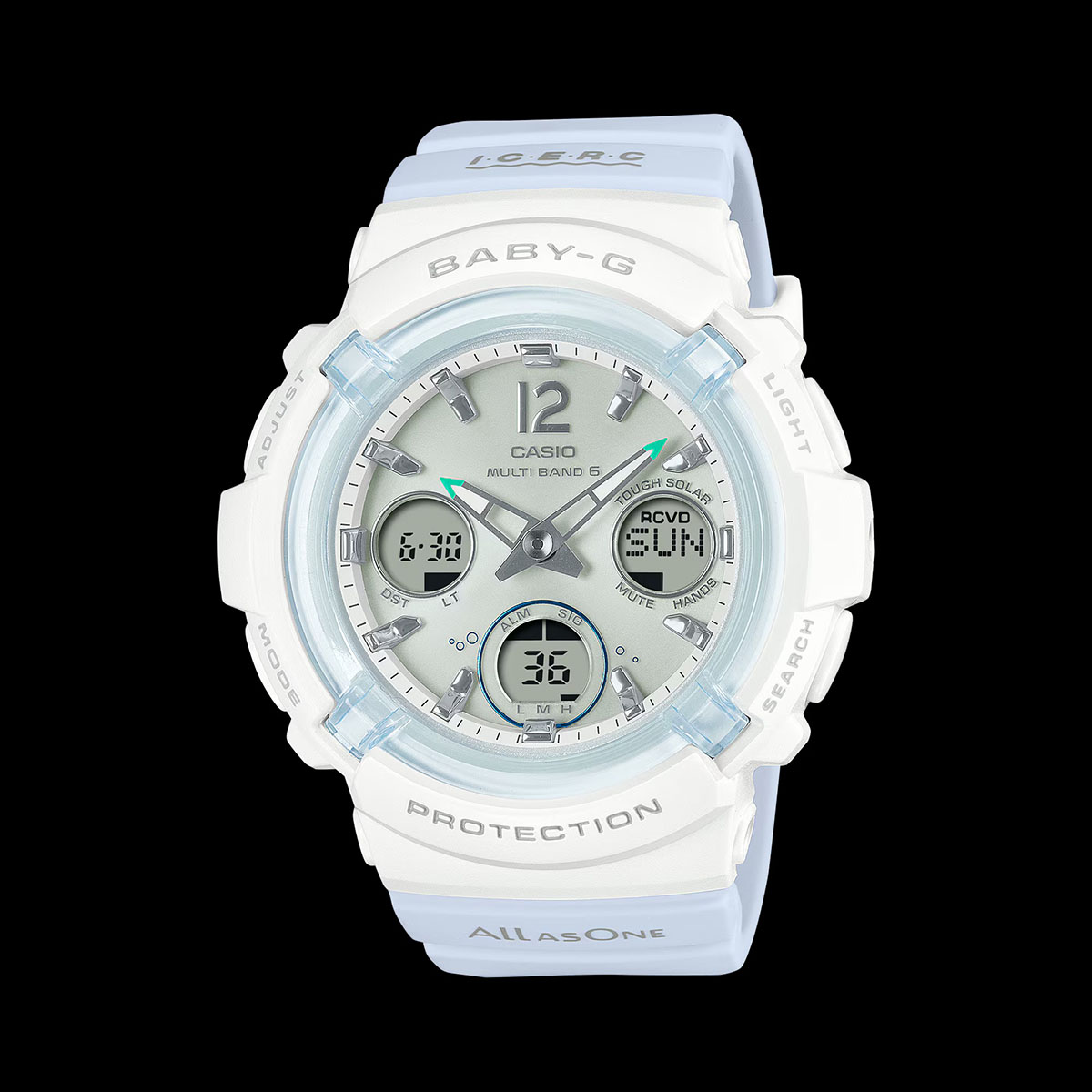BGA-2800K-7AJRは、丸い頭と愛らしい表情のスナメリから着想を得て、3つのサブダイアルを持ち、丸いシルエットの「BGA-2800」をベースとしている。体色をイメージしたホワイトをメインカラーに、スナメリが生息する近海をバンドのライトブルーで表現している。また、6時位置のインダイアルリングを“バブルリング”に見立て、鮮やかなブルーを配色している。