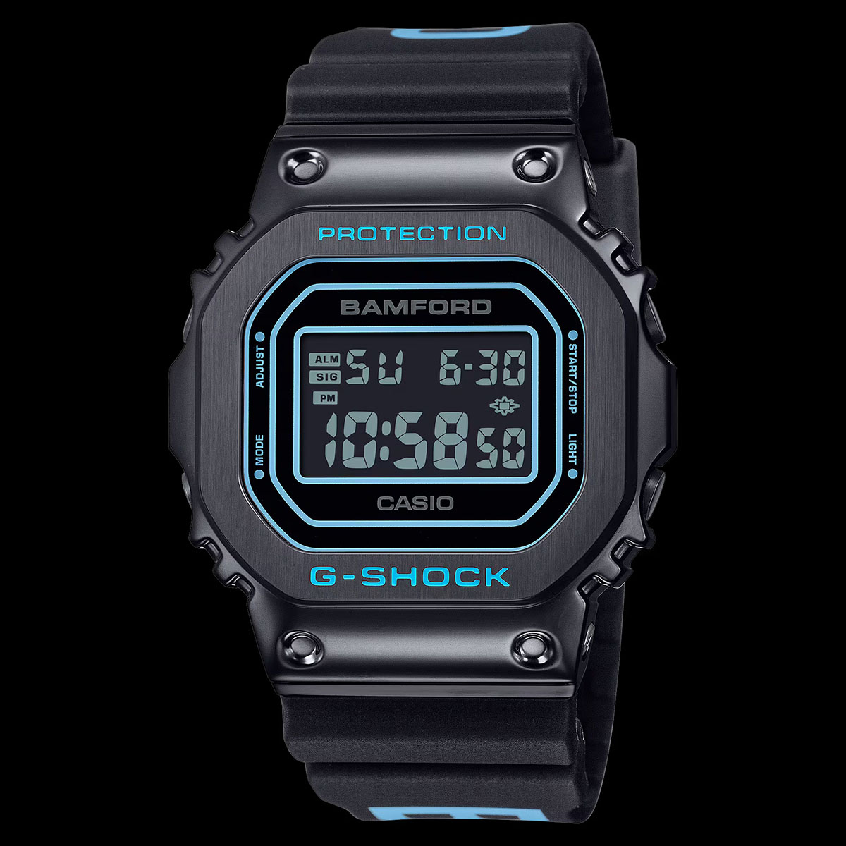 メタルベゼルの「GM-5600BWD-1JR」は、イギリスの時計デザイン工房のバンフォード ロンドンとのコラボレーション限定モデル。本作がこのコラボレーションの第3弾となる。全体をブラックでまとめながら、バンフォードの象徴的なライトブルーを随所に取り入れている。特にバンド全体に配置した“5600”と“BAMFORD”のブルーは印象的なデザインである。すべての金属部分にはオールブラックのIP処理が施され、シックな装いをまといつつブルーの表現に力を注いだ、バンフォードらしいデザインとなっている。