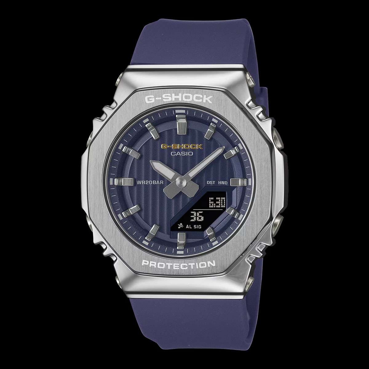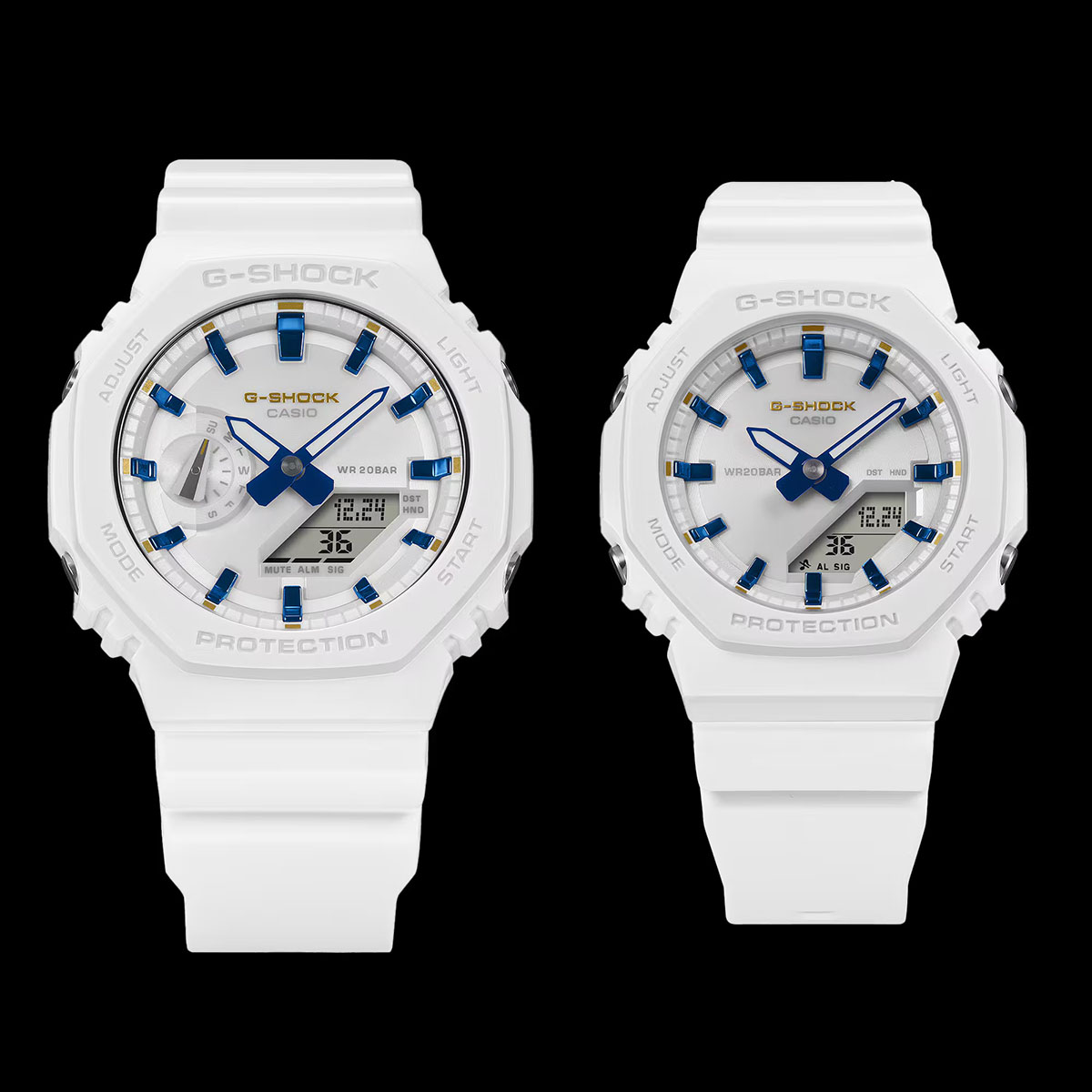 「プレシャスハートセレクション GM-S2110SH-7AJF」は、“Wish upon a star”をテーマに、星が舞降る様子をデザインコンセプトとした冬限定モデル。雪化粧や冬の澄み切った空気を想起させるホワイトを基調として、G-SHOCKロゴのゴールド、文字盤上のストライプパターンのそれぞれで星が降り注ぐ様子を表現している。文字盤にメタル素材を採用することで光沢感が加えているほか、ベゼルとインデックスにはヘアライン加工を施して質感を高めている。「GM-S2110SH-2AJF」も同様のコンセプトでデザインされており、こちらは夜空をイメージしたネイビーモデルとなる。