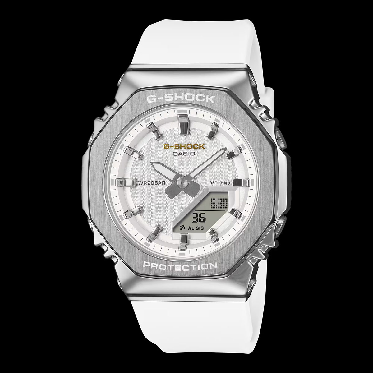 「GM-2100TTTR-8AJR」は日本を代表するロックバンドのONE OK ROCKとのコラボレーションモデル。2025年にONE OK ROCKは結成20周年を迎え、これを記念して本作は企画された。シルバーカラーのベゼルとケース、ホワイトマットスケルトンのバンドのデザインで、目を引くのが文字盤だ。ブラック文字盤にはグラデーション加工を施した桜が散りばめられ、9時位置のインジケーターには刀のモチーフを採用して、日本文化の持つ優雅さと伝統を表現している。
